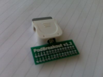 When I picked up my iPod classic the friday before gangshow the first thing I thought after unboxing it and loading it with tunage is what a fab dock the box would make. Today this widget arrived from sparkfun which means I can access every pin in the dock connector.